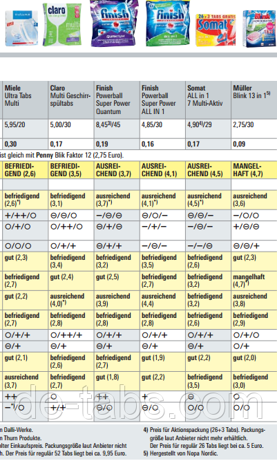 У тестуванні порівнювалися 12 різних торгових марок. Зверніть увагу: деякі німецькі торговельні мережі настільки великі, що розділені на кілька частин або кілька торговельних мереж можуть належати до однієї корпорації – в цьому випадку ОДНА і ТА Ж таблетка може мати кілька різних назв торгових марок. Наприклад, таблетки Alio Complete = Akuta All-in-One = Magnum і продаються в різних частинах мережі Aldi. Або таблетки Ja 12in1 (мережа Rewe) мають назву Blik Faktor 12 (торгова мережа Penny)